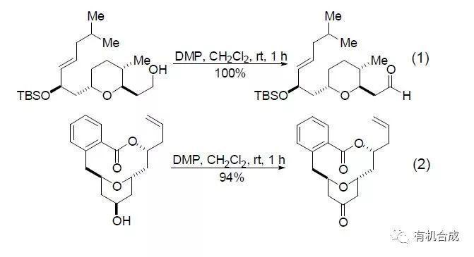 DMP 對醇的氧化反應條件非常溫和,一般在低溫下加料,在室溫下反應。大多數反應在數分鐘至數小時內完成,產率正常維持在較高或者非常高的水平。由于DMP 在氧化反應完成后有乙酸和碘的生成,后處理時可使用Na2CO3 和Na2S2O3 水溶液進行洗滌除去乙酸和碘 (式1, 式2)[4,5]。