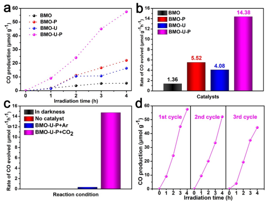 ▲圖四. 模擬太陽光下CO的(a)產量和(b)產率,(c) BMO-U-P分別在不加光、無催化劑、無CO2條件下的對比實驗,(d) BMO-U-P的循環測試。