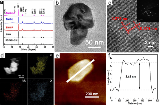 ▲圖二. (a) XRD, 電暈極化處理的Bi2MoO6薄層納米片(BMO-U-P)的 (b) TEM, (c) HRTEM, (d) EDS, (e) AFM和(f) 對應的厚度。