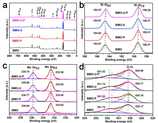 ▲圖三. (a) XPS全譜, (b) Bi 4f, (c) Mo 3d and (d) O 1s的XPS圖。