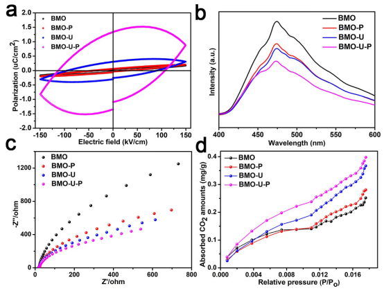 ▲圖六. Bi2MoO6系列樣品的(a)電滯回線,(b)光致發光譜圖,(c) 電化學阻抗譜和(d) CO2吸附等溫線。