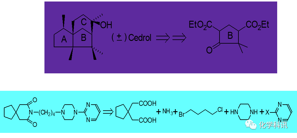 它有一整套斷開位置規律的總結,可分成無環鍵和環鍵,環鍵又可分成孤立環、螺環、稠環、橋環等體系。當然,反合成分析時,有一些環可以保持的,即作為不變的主體結構(building blocks)對待。反合成中,這些環保持不變。合成時,他們直接來自原料。