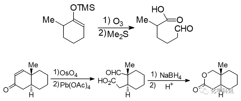 例如環中雙鍵的斷裂就是常遇到的問題。一般可以采取兩種方法:一是用臭氧化,一步就可完成;另一要兩步才能完成,如OsO4---Pb(OAc)4法等。見下面兩個反應。