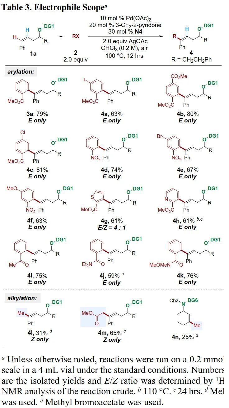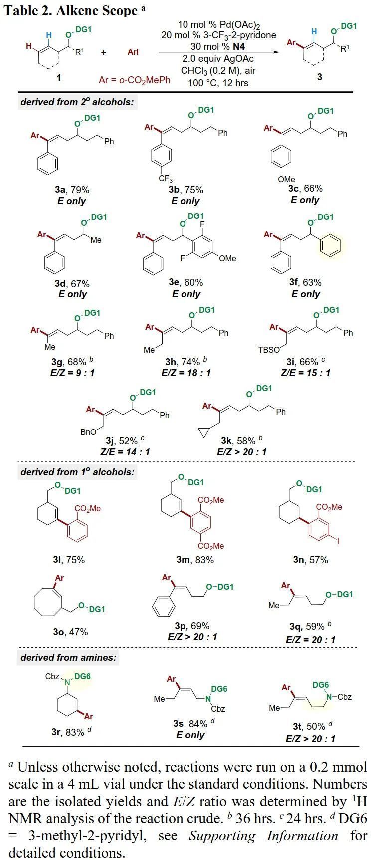 在確定最佳反應條件后,作者研究了烯烴的適用范圍(Table 2)。含缺/富電子取代基的苯乙烯基烯烴、六元或八元環烯以及順式1,2-二烷基取代的烯烴是適合的底物。盡管芳烴上有潛在的副反應,但苯基取代的底物仍可得到遠端烯烴芳基化產物。除脂肪族醇外,芐醇衍生的底物也反應良好;除仲醇外,伯醇衍生的底物也能參與反應,而與伯醇衍生的鏈烯的反應性較低。此外,當用改良的DG后,烯丙基和高烯丙基保護的胺也反應良好。
