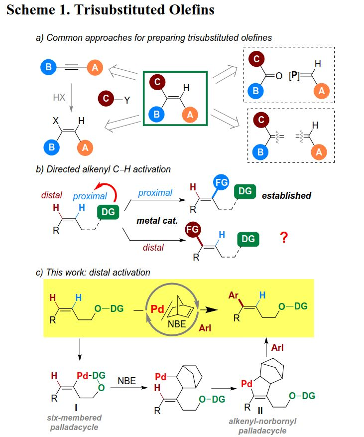 三取代烯烴是許多天然產物以及生物活性化合物的常見結構片段,也常作為合成中間體構建其他官能團,如環氧化物、(氮雜)環丙烷等。目前,三取代烯烴主要通過羰基的烯化、炔烴的加氫官能團化、交叉偶聯和烯烴復分解等方法來制備(Scheme 1a)。在不存在空間位阻或電性偏向的情況下,區域和立體選擇性合成三取代烯烴尤為重要。由于鄰近效應,通過導向基團可以提高烯基C-H活化的反應性和位點選擇性(Scheme 1b)。迄今為止,許多過渡金屬絡合物(如Ru、Pd、Rh、Ir、Fe和Co)可以實現近端烯基C-H鍵的官能團化。然而,對于通過遠端烯基C-H鍵的位點選擇性活化實現區域選擇性合成三取代烯烴的研究鮮有報道。近日,美國芝加哥大學董廣彬課題組通過鈀/降冰片烯(Pd/NBE)協同催化實現了遠端烯基C-H官能團化(Scheme 1c),該成果發表于近期J. Am. Chem. Soc.(DOI: 10.1021/jacs.9b11479)。