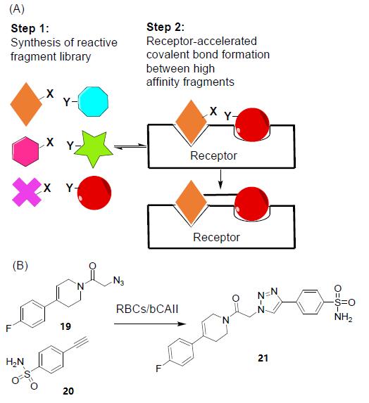 KTGS是利用原位點擊反應可生成的分子來抑制靶點 大分子(蛋白和DNA)作用,為先導物質的鑒定和優化提供了一種很有前途的策略。在KTGS中,一對具有互補反應性的高度親和力的片段與目標受體結合,受體加速高親和力片段間共價鍵形成,通過穩定互補片段與受體形成的三元配合物產物構象,使互補反應性的片段之間的反應不可逆,從而對目標受體自身產生抑制作用。(如圖8A所示)Antti和同事用碳酸酐酶II抑制劑進行了以細胞為基礎的KTGS研究。例如,將具有豐富的碳酸酐酶II的牛血紅細胞在疊氮化物19和含炔化合物20中培養,以實現化合物21的靶向合成(如圖8B所示)。疊氮化物19與含炔化合物20是具有高度親和力的互補片段,分別與RBCs/bCAII相應位點結合后,在RBCs/bCAII中發生點擊化學反應下形成共價鍵,生成化合物21。21與RBCs/bCAII的穩定結合使RBCs/bCAII的功能得到抑制。