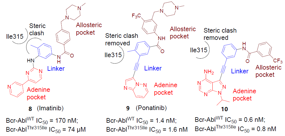 BCR-Abl激酶在慢性粒細胞白血病(CML)中起著關鍵作用,因此,它是腫瘤學的重要靶點。如圖5所示,化合物8(伊馬替尼)在CML患者中的臨床耐藥性與BCR-Abl激酶中保守殘基Thr315Ile的突變有關。Ile315的側鏈變異膨脹后,與藥物伊馬替尼結合時產生空間碰撞,導致結合親和力喪失,從而產生耐藥性。在伊馬替尼結構中的腺嘌呤結合部分和變構口袋結合部分之間用乙炔做連接基產生的化合物9(帕納替尼),有效的避免了與BCR-Abl激酶中Ile315龐大的側鏈發生空間沖突。但帕納替尼也具有血塊和血管狹窄等副作用。為此,藥物學家使用一個新的腺嘌呤結合部分和變構口袋結合部分通過炔基連接產生了化合物10。化合物10對野生型以及Thr315Ile突變型BCR-Abl激酶均具有良好的抑制性。