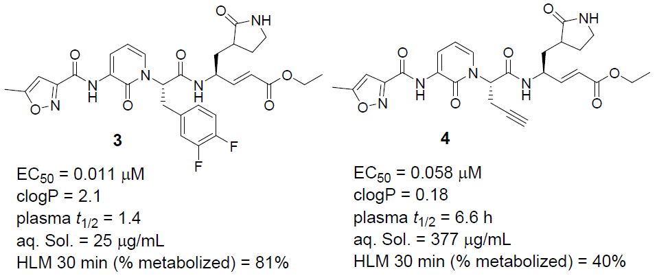 Dragovich和他的同事報告了人類鼻病毒3C蛋白酶2-吡啶酮類抑制劑的藥代動力學優化過程。如圖3所示,化合物3中存在的3,4-二氟芐基部分被一個炔丙基所取代以獲得化合物4,雖然效力有所下降。但化合物4的極性、水溶性、代謝穩定性增加,血漿半衰期延長,藥代動力學性質顯著改善。