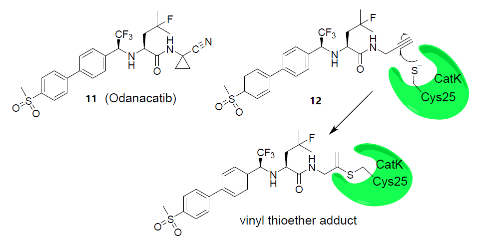 針對特定目標蛋白的高選擇性共價抑制劑在臨床上的應用越來越廣泛,然而,抑制劑中使用高活性的親電彈頭有可能導致對非目標蛋白不加區分的共價修飾并產生毒性。因此,使用反應活性較低的親電彈頭基團,如炔基,則成為不可逆親電抑制劑研發的重點方向。以將組織蛋白酶K(CatK)的可逆抑制劑11(Odanacatib)轉化為不可逆的潛在親電抑制劑12為例,闡述乙炔在不可逆抑制劑中作為潛在親電基的應用。