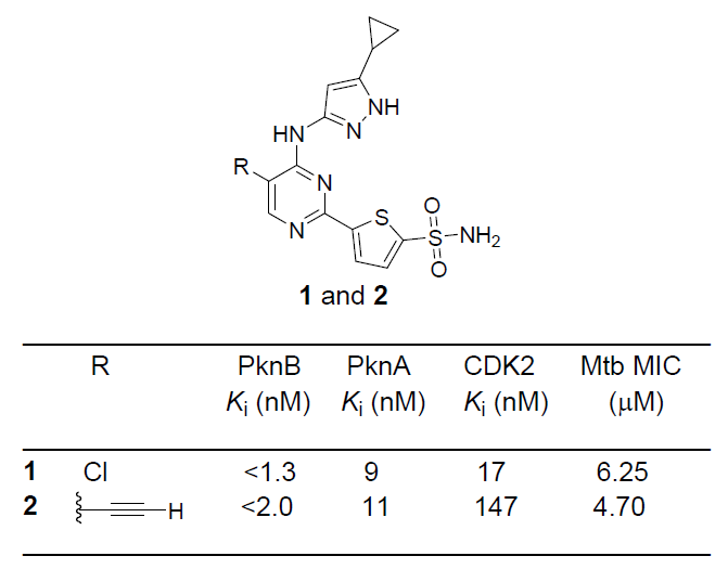 以Mtb(結核分枝桿菌)中PknA/PknB雙抑制劑1和2為例,具體闡述乙炔基作為生物等排體在藥物化學中的應用。結核分枝桿菌的蛋白激酶A(PknA)和蛋白激酶B(PknB)由于其在細菌細胞生長中的重要作用,藥物研發時以該兩種激酶為靶點,以獲得有效的抑制劑,從而降低結核分枝桿菌耐藥性。如圖2所示,研究表明,化合物1對兩種激酶具有微摩爾級別的抑制作用。但對哺乳動物細胞周期蛋白依賴性蛋白激酶CDK2的選擇性較差。1與PknA和PknB結合的X射線晶體結構顯示,甘氨酸殘基翻轉形成的口袋(Gly100 in PknA and Gly97 in PknB)導致化合物1對哺乳動物細胞周期蛋白依賴性蛋白激酶CDK2的選擇性較差,而對Mtb激酶的選擇性較好。化合物2中是用5-乙炔基取代化合物1中的5-氯基時,不僅保持了化合物2對Mtb激酶的效力以及抗菌活性,還提高了對CDK2激酶的選擇性。由化合物1與2的抑菌效力可見,炔基與鹵素氯互為生物等排體。