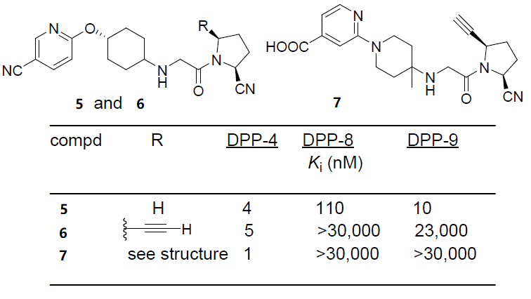 開發具有明確靶向性的抑制劑一直是藥物學家限制脫靶效應的首要任務。為了實現這一目標,可在分子內插入乙炔基團以提高分子靶向性。DPP-4抑制劑即二肽基肽酶 Ⅳ抑制劑,是治療2型糖尿病的新靶點, 能夠迅速滅活腸促胰島素胰高血糖素樣肽-1( GLP-1)和糖依賴性胰島素釋放肽(GIP)等多種激素。提高內源性GLP-1和GIP的活性,促進胰島B細胞釋放胰島素,同時抑制胰島 A 細胞分泌胰高血糖素,從而提高胰島素水平,降低血糖,且不會誘發低血糖和增加體重。在二肽基肽酶 Ⅳ抑制劑(DPP-4)抑制劑中插入乙炔基團增強其靶向性成為DPP-4特異性抑制劑,對與其密切相關的DPP-8和DPP9亞型則不具備抑制性。如圖4所示,在化合物5的2-氰基吡咯烷部分的C5位置安裝了一個乙炔基團,得到化合物6,與5相比,6對DPP-4選擇性與DPP-8和DPP-9相比有相當大的提高。在吡咯環上保留氰基和乙炔取代基的基礎上,用C4-甲基哌啶取代了環己基羥基連接劑,并用異煙酸替換氰吡啶環獲得化合物7(ABT-279)。 進一步提高了對DPP-4的抑制效力和選擇性,對特異性治療2型糖尿病藥物的研發提供新途徑。