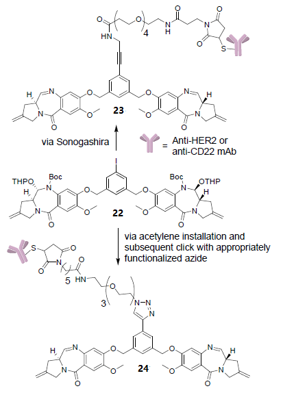 圖9 吡咯-苯二氮卓二聚體22的結構及相應含炔/三唑基的抗半胱氨酸HER2或抗CD22抗體23、24結構