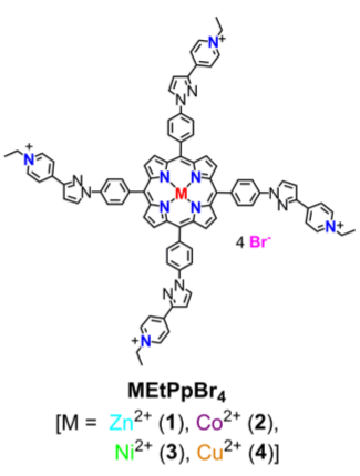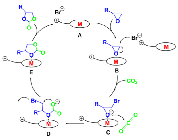 近期,西北大學的研究團隊在Applied Organometallic Chemistry (2020, DOI:10.1002/aoc.5382)上發表了題為“Pyridinium-functionalized metalloporphyrins as bifunctional catalysts for cycloaddition of epoxides andcarbon dioxide”的文章,以含吡啶基的市售卟啉H2Pp(Pp=5,10,15,20-四(4-(4-吡啶基)吡唑基)苯基)卟啉)為起始原料,制備了吡啶官能化的金屬卟啉(MEtPpBr4)雙功能催化劑(圖1),用于催化環加成反應合成環狀碳酸酯。以環氧丙烷為原料,研究發現當環氧丙烷(PO)與催化劑的摩爾比為2222時效果最好(8 h后PC的收率達到99.0%),吡啶基的連接單元使催化劑具有很強的剛性,與以往報道的具有柔性鏈的雙功能金屬卟啉催化劑不同。以ZnEtPpBr4和CoEtPpBr4為催化劑,在P(CO2)=2 MPa、120 ℃、無溶劑條件下,反應8 h后,以大于99.9%的選擇性和幾乎定量的產率得到相應的環狀碳酸酯。他們得出可能的機理:首先,金屬卟啉的路易斯酸性中心激活環氧化合物;然后,環氧化物中空間位阻較小的C原子受到路易斯堿位點Br-陰離子的親核攻擊,形成氧陰離子中間體C,C的O-攻擊CO2生成金屬碳酸鹽中間體D;最后,經過D環合并釋放Br-生成環狀碳酸鹽(圖2)。這項工作為開發高效均相和非均相金屬卟啉催化劑用于環氧化物和二氧化碳的環加成反應提供了研究基礎和思路。