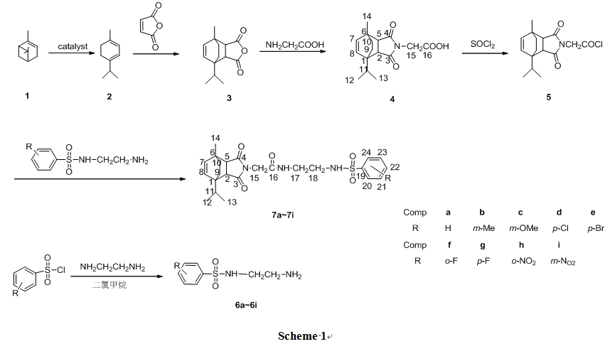 磺酰胺類化合物的結(jié)構(gòu)中含有-SO2和-NH-基團,此類含硫、氮原子及活潑氫的化合物顯示出殺菌、除草、殺蟲和抗癌等廣泛的生物活性,在農(nóng)藥和醫(yī)藥等方面有較多應(yīng)用。近年來,本課題組在松節(jié)油基新型生物活性化合物的合成方面取得了一系列研究成果。