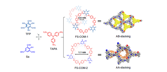 圖1:單體的結構和設計的兩種獨立式COF膜。TFP,Sa和TAPA分別是1,3,5-三甲?;g苯三酚,2,4,6-三甲?;椒雍腿?/span>4-氨基苯基)胺的縮寫。紅色,藍色,灰色和白色球體分別表示O,N,C和H原子。