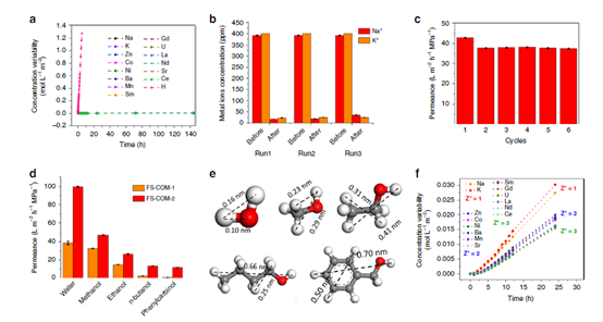 圖5:膜性能研究。a:FS-COM-1滲透部分中14種共存陽離子的濃度變異性。通過將所需的金屬氧化物或硝酸鹽溶解在濃硝酸中,然后用去離子水稀釋來制備包含14種共存陽離子的多離子溶液。b:在三個過濾循環中,FS-COM-1在0.1MPa的Na2SO4或K2SO4排斥性能。c:FS-COM-1的六個過濾循環的透水性。d:對于FS-COM-1和FS-COM-2,溶劑尺寸的增加。e:通過MS計算的所選溶劑的分子大小。f:對于FS-COM-1-VF,滲透部分中14種共存陽離子的濃度變化。b和d中的誤差線顯示基于三個獨立測量值的標準偏差。紅色,灰色和白色球體分別表示O,C和H原子。