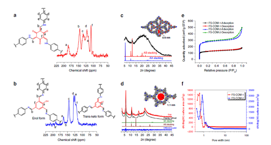 c:FS-COM-1的PXRD模式在偏光AA堆疊模式和AB堆疊模式的實驗模式與模擬模式之間進行比較。d:FS-COM-2的PXRD圖樣在實驗圖和Pawley精煉圖之間進行比較,AA堆積模式,AB堆積模式和精煉差異圖的模擬圖。e:FS-COM-1和FS-COM-2的N2吸附等溫線。f:FS-COM-1和FS-COM-2的孔徑分布。紅色,藍色,灰色和白色球體分別表示O,N,C和H原子。