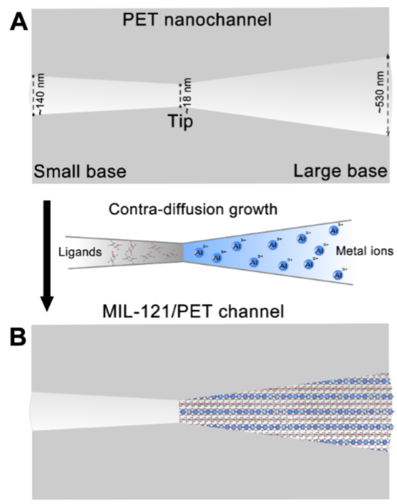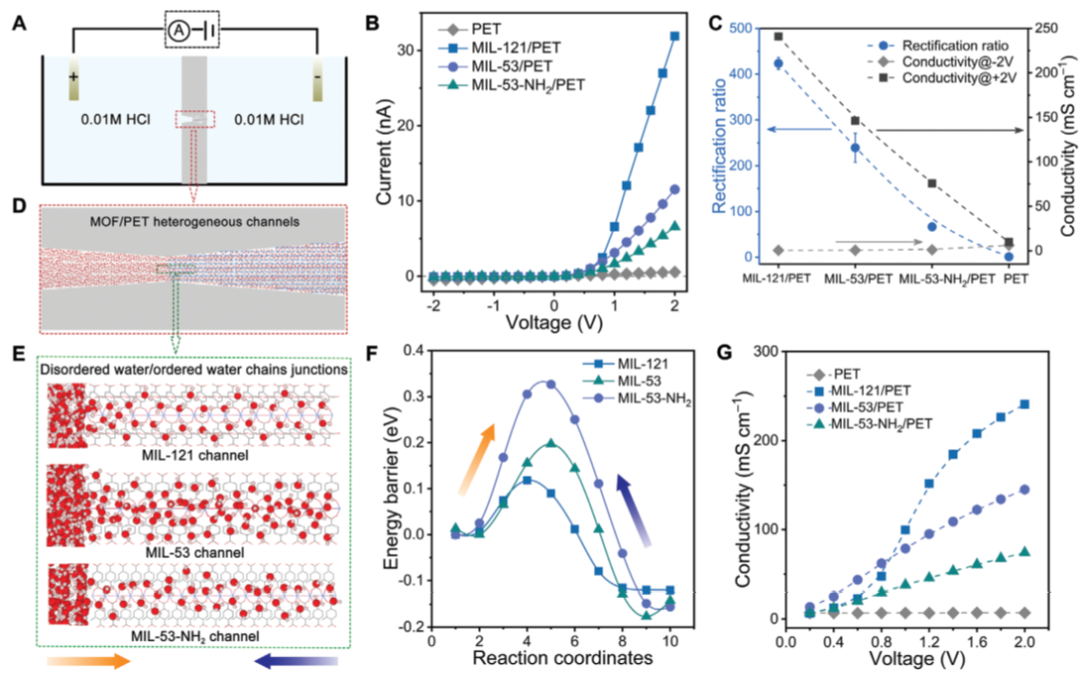 為了解決這一問題,近日,澳大利亞莫納什大學(xué)王煥庭院士、 Zhang Huacheng教授團隊聯(lián)合中國科學(xué)技術(shù)大學(xué)吳恒安教授團隊開發(fā)了一種納米-亞納米尺寸漸變的非對稱沙漏結(jié)構(gòu)PET/MOF復(fù)合質(zhì)子通道,顯示出了單向傳輸?shù)奶攸c和極高的質(zhì)子選擇性傳輸。其中,綜合性能最優(yōu)異的PET/MIL-121通道最大整流比接近500,質(zhì)子傳導(dǎo)率高達240 mScm?1。在研究中作者結(jié)合分子模擬發(fā)現(xiàn),PET/MOF復(fù)合通道內(nèi)部的高傳輸效率來源于MOF內(nèi)部由分子間氫鍵和限域作用聯(lián)合形成的有序“水鏈”結(jié)構(gòu),并且不同的MOF會導(dǎo)致不同的“水鏈”結(jié)構(gòu);比如MIL-121型MOF內(nèi)部形成了五邊形“水鏈”結(jié)構(gòu),與MOF中的羧酸基團形成的三維網(wǎng)絡(luò)結(jié)構(gòu)通道可以使質(zhì)子快速而高效的通過。同時,質(zhì)子從納米級別的PET通道傳輸?shù)絹喖{米級別的MOF通道過程中能壘較小,因而賦予了復(fù)合通道單向傳輸?shù)奶匦?/span>。另外,亞納米MOF通道內(nèi)部特殊的理化性質(zhì)也使得PET/MOF復(fù)合通道具有高的質(zhì)子選擇性——在不同濃度差的HCl溶液中,H+/Cl-的選擇性>20,而純PET納米通道的選擇性僅有5.6左右。這項研究以題為“Unidirectional and Selective Proton Transport in Artificial Heterostructured Nanochannels with Nano-to-Subnano Confined Water Clusters”的論文發(fā)表在《Advanced Materials》上。