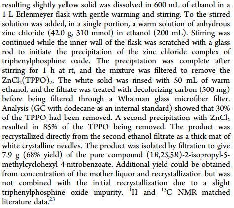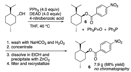 該方法的效果如何,看看作者的實例分析。以下面的Mitsunobu反應為例,正常的后處理后,只需要將粗產物溶于乙醇中,再加氯化鋅,過濾,重結晶即可無需柱層析得到純的化合物。
