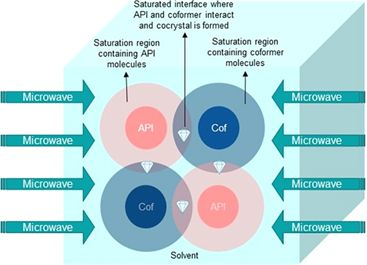 微波誘導與旋轉分子偶極矩增強分子活性與激發能。微波誘導的共晶結晶技術原理如圖4所示。微波輻射誘導的介電能使API與配體分子達到飽和狀態,在API與配體飽和區交界面處為共晶結晶區。介電能依賴于物料的介電性質,即將微波能轉變為熱能的能力。