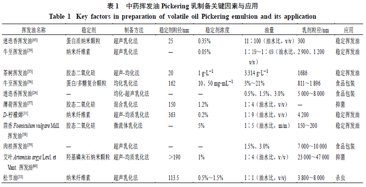 中藥揮發油Pickering乳制備關鍵因素與應用見表1。