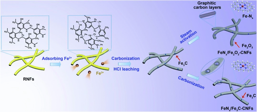 ▲ | 圖 1. FeNx 和 γ-Fe2O3 共功能化中空石墨化碳納米纖維材料(FeNx / Fe2O3 -CNFs)的制備示意圖。 |