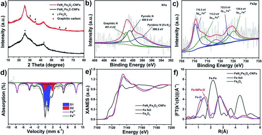 XPS 研究表明,催化劑中吡啶- N 含量高達 46.56%,能有效提高催化劑的活性,使其具有良好的表面潤濕性和起峰電位。另外,我們還通過 HAADF-STEM、穆斯堡爾譜、同步輻射 XANES 和 EXAFS 分析證明了 FeNx 在 FeNx / Fe2O3 -CNFs 中的存在。