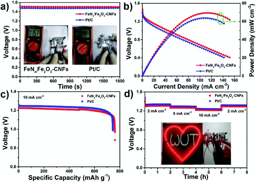 ▲ | 圖 5. 基于 FeNx / Fe2O3 -CNFs 和 Pt/C 催化劑組裝的水系鋅空氣電池性能。開路電壓穩定性(a);放電極化曲線以及對應的功率密度圖(b);10 mA cm-2 電流密度下的放電曲線(c);不同電流密度下的倍率性能(d),插圖為點亮 LED 燈板的數碼照片 |