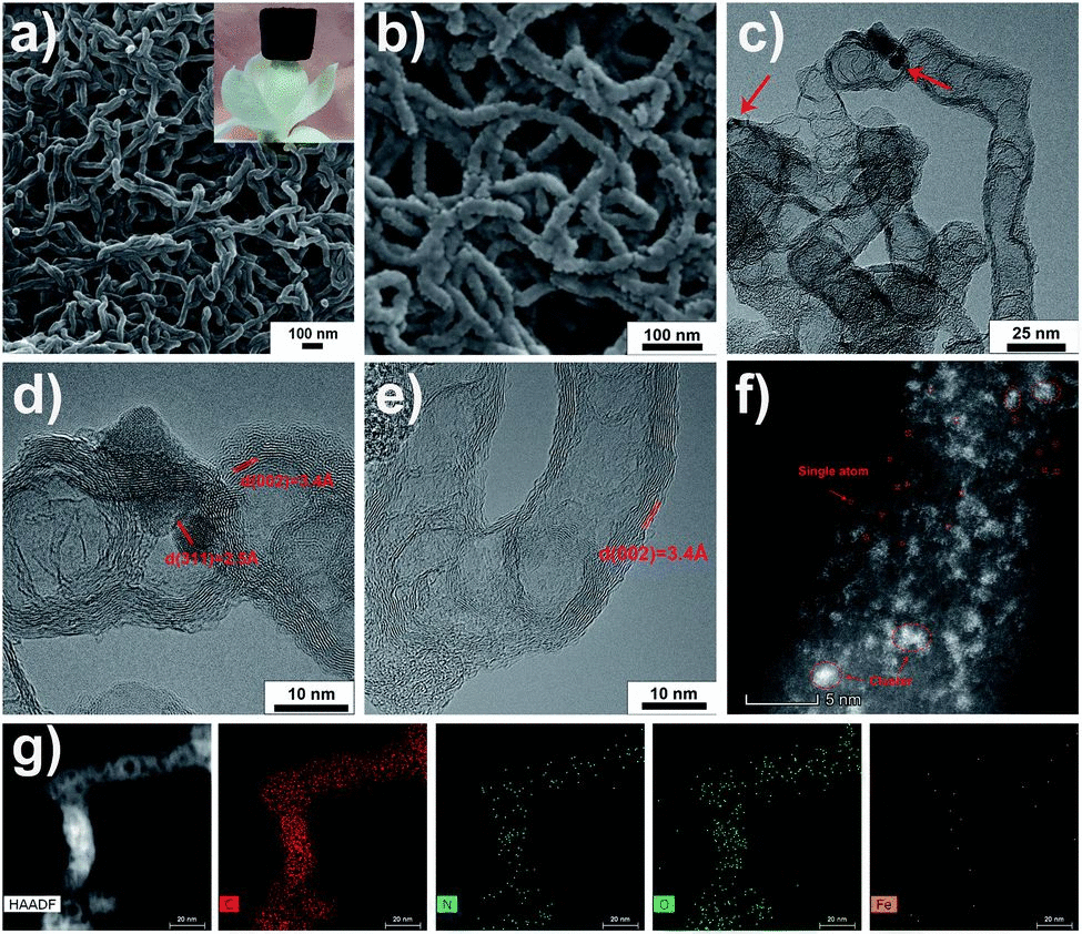 ▲ | 圖 2. RNFs 樹脂納米纖維的 SEM 圖(a),插圖為 RNFs 氣凝膠;FeNx / Fe2O3 -CNFs 的SEM(b),TEM(c),高分辨 TEM 圖(d-e)和 HAADF-STEM 圖(f);對應的 EDS 元素面掃圖(g)。 |