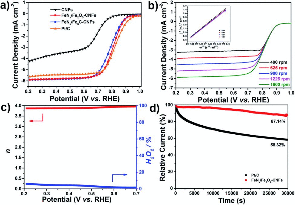 ▲ | 圖 4. 不同催化劑樣品的 LSV 曲線(a);FeNx / Fe2O3 -CNFs 在轉速為 400-1600 轉之間的 LSV 曲線,插圖為對應的 K-L 圖(b);FeNx / Fe2O3 -CNFs 催化劑在 0.2 ~ 0.7 V 之間的電子轉移數和過氧化氫產率(c);穩定性測試(d) |
