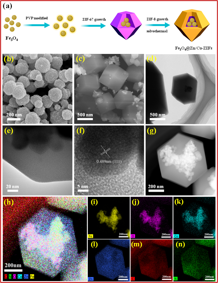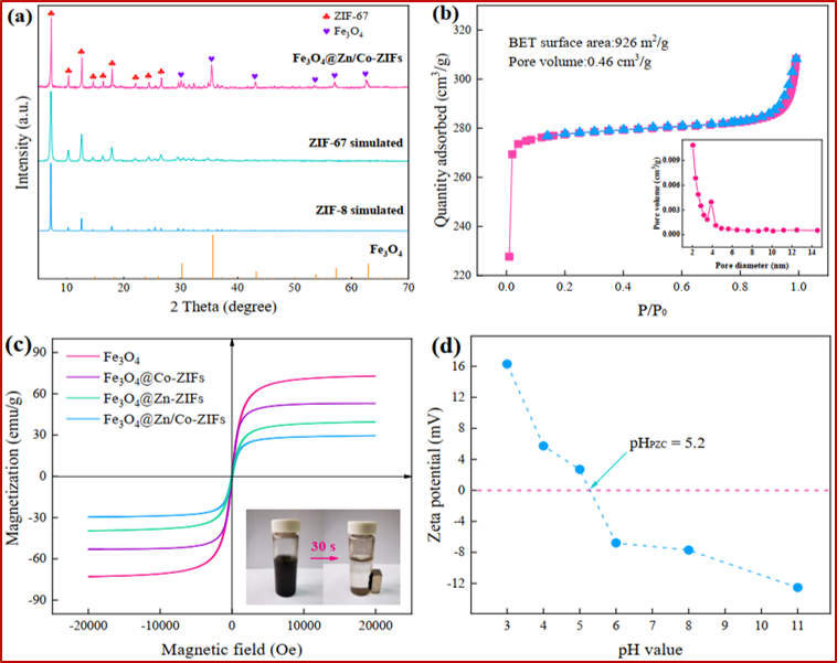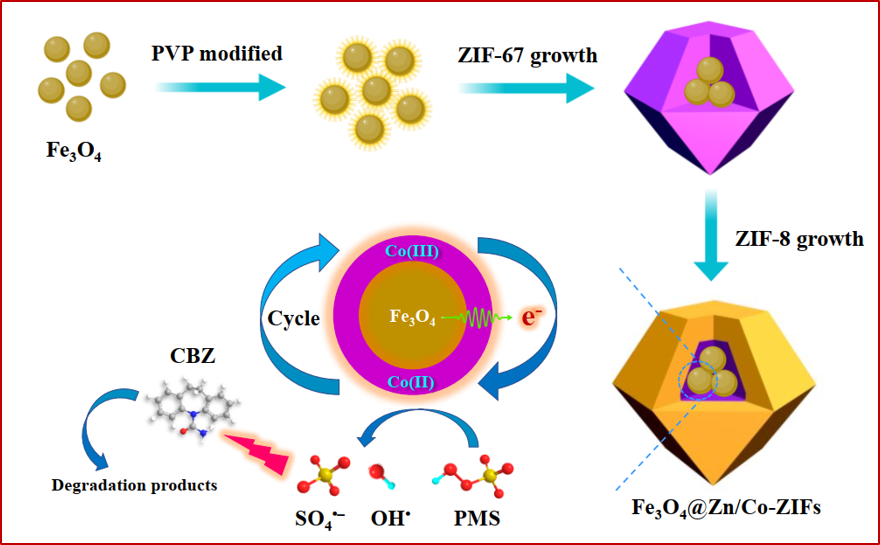 論文DOI: 10.1016/j.apcatb.2020.119136近日,四川大學賴波教授課題組在Applied Catalysis B: Environmental上發表了題為“Core-shell magnetic Fe3O4@Zn/Co-ZIFs to activate peroxymonosulfate for highly efficient degradation of carbamazepine”的研究論文(DOI:10.1016/j.apcatb.2020.119136),該研究使用磁性核殼金屬-有機骨架材料(metal-organic frameworks,MOFs)為催化劑,活化過一硫酸鹽(PMS)高效降解水中的有機污染物,研究了催化劑的結構特性和催化性能,探究了反應機理和污染物降解途徑,并分析了催化劑穩定性及循環利用性能。對藥物和個人護理產品(PPCPs)和酚類有機物都表現出良好的降解效果。典型污染物卡馬西平(carbamazepine,CBZ)在30 min內完全降解,此外,該催化劑還表現出良好的可回收性和通用性,適用于不同的底物環境,為MOFs材料在環境修復中的應用提供了新的思路。在過去的幾十年里,藥品和個人護理用品(PPCPs)的廣泛使用使得它們不斷被排放到水生環境中。其中卡馬西平(CBZ)被廣泛用于治療抑郁癥、癲癇和三叉神經痛,是水生環境中最常被檢測到的36種藥物之一,研究表明,CBZ殘留于水環境具有較高的環境風險,使組織退化變形,也對生物生殖能力和水生生物胚胎發育有不利影響,潛在威脅人類健康。因此,迫切需要探索有效的技術來消除CBZ殘留對生態系統和人類健康的不利影響。然而,CBZ在環境中具有很強的持久性,不能被傳統的廢水處理技術有效去除。高級氧化技術(AOPs)是通過產生具有高氧化還原電位的活性氧物種(ROS)的手段,如SO4?–和OH?,將難降解大分子有機污染物分解為小分子物質甚至實現礦化。PMS是一種典型的氧化劑,在活化過程中,PMS分子的過氧鍵斷裂可產生SO4?–,其氧化還原電位為(2.5-3.1 V),與OH?(1.9-2.7 V)的氧化還原電位相當。金屬-有機骨架材料(MOFs)是一種由金屬離子和有機配體配位形成的新型多孔材料,近年來受到越來越多的關注,并在環境修復領域得到了應用。本文設計了一種磁性核殼MOFs復合物作為催化劑,研究了催化劑的結構特性和催化性能,探明了反應機理和CBZ降解途徑,并分析了催化劑穩定性及循環利用性能。結果表明,該體系對不同類型的有機污染物都表現出良好的去除效果,此外,該催化劑還表現出良好的可回收性和通用性。機理研究表明,Co-ZIFs是主要催化活性位點,通過產生活性物種SO4?–和OH?,使其在室溫下氧化有機污染物。高級氧化技術(AOPs)是一種處理有毒和生物難降解的污染物的有效手段,PMS是最廣泛使用的一種氧化劑之一,利用外加UV、超聲波、熱、電化學、碳基催化劑和過渡金屬離子(如Fe2+、Mn2+、Ni2+、Cu2+和Co2+)等途徑活化生成SO4?–和OH?攻擊污染物。然而,考慮到外加光源和電場等方法的高耗能和均相催化中金屬離子對環境的污染,有必要開發出性能良好的非均相催化劑。在此,我們通過簡單的溶劑熱法一鍋合成了一種磁性Fe3O4與MOFs材料的復合物,用于活化過一硫酸鹽高效去除有機污染物。對不同類型的有機污染物都表現出良好的去除效果,此外,該催化劑還表現出良好的可回收性和通用性,適用于不同的底物環境,為MOFs材料在環境修復中的應用提供了新的思路。Fig. 1. (a) Schematic illustration of the preparation process of Fe3O4@Zn/Co-ZIFs. SEM image of (b) Fe3O4 and (c) Fe3O4@Zn/Co-ZIFs, (d-e) TEM, (f) HRTEM, (g) HAADF-STEM image and (h-n) element mapping of Fe3O4@Zn/Co-ZIFs.通過SEM圖可以看出,制備的Fe3O4和Fe3O4@Zn/Co-ZIFs均具有良好的分散性,材料均呈現出ZIFs典型的菱形十二面體結構。透射電鏡顯示,所得到的Fe3O4@Zn/Co-ZIFs具有明顯的核-殼結構,Fe3O4位于核心,雙金屬ZIFs作為外殼包裹。HAADF-STEM和相應的EDS元素映射結果顯示, Zn、C、N元素均勻分布在殼層,而Fe、Co、O元素主要分布在納米復合材料的核心部分。因此,這些結果表明我們成功制備了獨特的磁性Fe3O4@Zn/Co-ZIFs納米復合材料,Fe3O4處于Fe3O4@Zn/Co-ZIFs納米復合材料中的核心,活性組分Fe3O4和Co-ZIFs被穩定的ZIF-8殼結構包裹。Fig. 2. (a) The XRD patterns; (b) N2 adsorption–desorption isotherms of Fe3O4@Zn/Co-ZIFs, (c) the magnetic hysteresis loops of Fe3O4, Fe3O4@Co-ZIFs, Fe3O4@Zn-ZIFs and Fe3O4@Zn/Co-ZIFs nanocomposites. The inset shows excellent magnetic separation property of Fe3O4@Zn/Co-ZIFs under an external magnetic field (30 s), (d) the zeta potential of Fe3O4@Zn/Co-ZIFs.XRD結果顯示Fe3O4@Zn/Co-ZIFs同時具有ZIFs和Fe3O4的晶體結構并且高度吻合,說明樣品同時存在ZIFs相和Fe3O4相,表明Fe3O4的成功包封,同時Fe3O4納米顆粒的引入對ZIF-8和ZIF-67的結晶度沒有影響,樣品的峰值強度與原始的ZIF-8和ZIF-67相比幾乎沒有變化。BET測量結果顯示,Fe3O4@Zn/Co-ZIFs的比表面積為926 m2/g,低于純ZIF-8的1580 m2/g,這主要是由于引入Fe3O4核心所造成的。孔徑分布圖顯示其為典型的微孔結構。一般而言,較高的表面積和微孔結構可以提供更多的的污染物和PMS富集位點,極大地提高了催化性能。利用振動樣品強磁計(VSM)對Fe3O4、Fe3O4@Co-ZIFs、Fe3O4@Zn-ZIFs和Fe3O4@Zn/Co-ZIFs的磁性能進行測定。根據VSM結果,它們的飽和磁化強度(Ms)值分別為72.9、53.1、39.6和29.6 emu/g。這些數值表明各個對照材料均具有較強的鐵磁性,利用外加磁場可以方便地分離,促進了納米復合材料的收集和回收。另外,Fe3O4@Zn/Co-ZIFs的pHpzc約等于5.2,表示它的表面在初始pH為3.0和5.0時帶正電,pH為7.0、9.0和11.0時帶負電。Fig. 3. (a, c) CBZ removal efficiencies, (b) residual PMS and (d) Co ions concentration in different systems (experiment conditions: [CBZ]0 = 5 mg/L,[catalyst]0