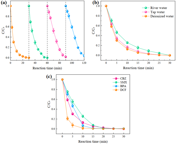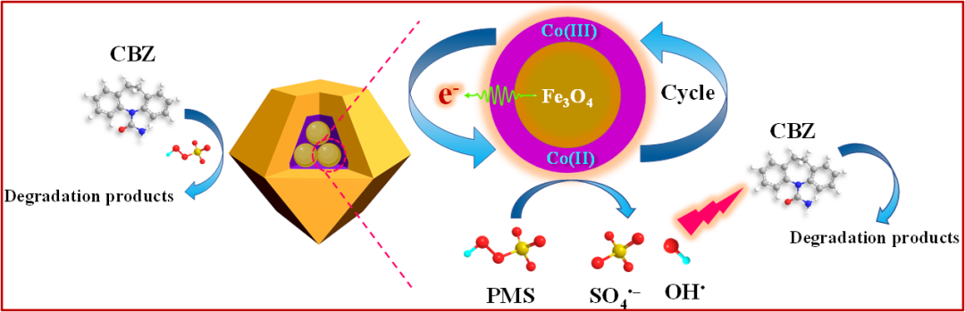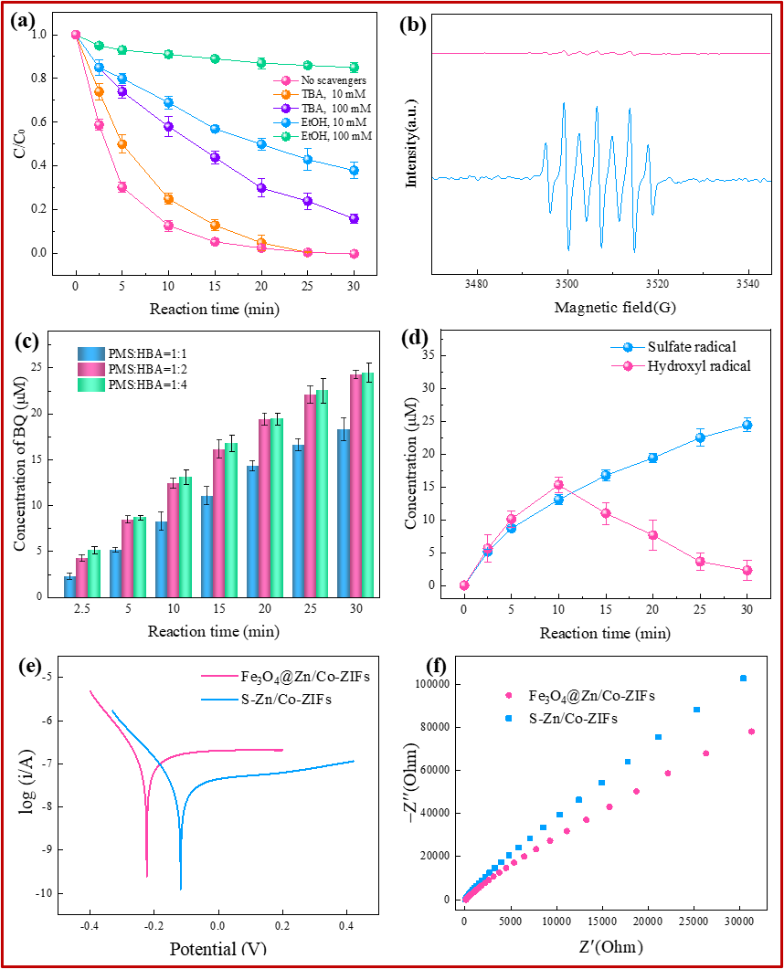 Fig. 4. (a) Recyclability of Fe3O4@Zn/Co-ZIFs for CBZ removal, (b) degradation of CBZ by Fe3O4@Zn/Co-ZIFs/PMS with the presence of actual waterbody, (c) removal efficiencies of various pollutants in Fe3O4@Zn/Co-ZIFs system (experiment conditions: [pollutant]0 = 5 mg/L, Fe3O4@Zn/Co-ZIFs = 25 mg/L, PMS = 0.4 mM, initial pH = 6.8, T = 30 °C).評估了Fe3O4@Zn/Co-ZIFs在PMS活化過程中的重復使用性和穩定性,在相同反應條件下進行了4次連續的CBZ降解實驗。連續4個周期后,CBZ去除效率分別為100%、100%、98.5%和95.9%,說明Fe3O4@Zn/Co-ZIFs在長時間運行中表現出良好的穩定性和催化活性。催化活性的輕微降低可能是由于少量污染物對反應位點的占據。從反應前后的SEM圖和XRD圖可以看出,使用過后的Fe3O4@Zn/Co-ZIFs與原始材料的對比沒有明顯的差異,說明了催化劑結構的穩定性。此外,為了證明該催化劑的普遍適用性,研究了Fe3O4@Zn/Co-ZIFs/PMS體系對實際水體和各種不同類型污染物的降解效率。在自來水中對CBZ的降解效果接近去離子水,使用河水時,CBZ降解速率常數明顯降低。可能的原因是河水中存在相對較高濃度的陰離子(磷酸鹽和碳酸氫鹽)和天然有機物。另外選取磺胺甲惡唑(SMX)、雙酚A(BPA)、雙氯芬酸(DCF)等3種不同的微污染物作為目標污染物,20分鐘內SMX、BPA和DCF在 Fe3O4@Zn/Co-ZIFs/PMS體系的去除率達到98.8%、99.3%和99.6%,在30 min內最終所有的污染物可以完全去除,這意味著Fe3O4@Zn/Co-ZIFs具有較強的普適性和一定的實際應用前景。Fig. 5. (a) Effects of different radical scavengers for the CBZ degradation in Fe3O4@Zn/Co-ZIFs/PMS system, (b) EPR spectra in Fe3O4@Zn/Co-ZIFs/PMS system with DMPO as the trapping agent, (c) concentration of BQ during reaction process at different PMS: HBA ratios, (d) relatively concentrations of sulfate radical and hydroxyl radical in Fe3O4@Zn/Co-ZIFs/PMS system, (e) Tafel polarization curves and (f) electrochemical impedance spectroscopic analysis of Fe3O4@Zn/Co-ZIFs and S-Zn/Co-ZIFs (experiment conditions: [CBZ]0 = 5 mg/L, [Fe3O4@Zn/Co-ZIFs]0 = 25 mg/L, [PMS]0= 0.4 mM, [DMPO] = 100 mM, initial pH = 6.8, T =30 °C).自由基猝滅實驗揭示了體系的自由基機制,SO4?–是主要的活性物種起主導作用,自由基定量實驗結果表明,SO4?–和OH?都參與了CBZ的降解,SO4?–在整個反應過程持續大量生成,而OH?僅在初始階段呈現一定強度,說明隨著反應時間的延長,SO4?–逐漸起到關鍵作用。Co-ZIFs是主要活性中心,Fe3O4的引入增加了催化劑的電子轉移能力,同時起到加速Co3+和Co2+的氧化還原循環的作用,使得催化劑高效催化PMS分解產生活性物種(SO4?–,OH?)。這些活性態氧物種可以與CBZ進行氧化反應,使其分解為小分子有機物,并進一步將其礦化為CO2和H2O。Fig. 6. The possible degradation mechanisms of CBZ in Fe3O4@Zn/Co-ZIFs/PMS system.這項工作通過簡單的溶劑熱法成功地制備出了由Fe3O4核心和Zn/Co-ZIFs外殼組成的核-殼納米復合物作為催化劑活化PMS降解污染物CBZ。將Fe3O4包封到一定的空間中,不僅賦予了MOFs復合材料一定的磁性,使其易于從水中分離,同時鐵和鈷之間有特殊的協同作用,提高了催化性能,對PMS活化表現出了優異的催化能力。此外,該催化劑還表現出良好的可回收性和通用性,適用于不同的底物環境,對不同類型的有機污染物都表現出良好的去除效果。猝滅實驗研究表明,與OH?相比,SO4?–是主要的活性物種。同時研究了Fe3O4與Zn/Co-ZIFs對PMS活化的協同作用,協同效應主要是由于Fe3O4和鈷活性位點之間的電子轉移,最終導致Co2+和Co3+的有效氧化還原循環。合理設計具有優良催化性能的雙金屬MOF包封Fe3O4為MOFs材料在PMS活化中的應用提供了新的思路。熊兆錕,副研究員,2018年6月博士畢業進入四川大學工作,主要從事環境工程水污染控制技術的科研工作。重點研究高級氧化技術及其在醫療污水中的應用,鐵基材料耦合高級氧化技術的基礎與應用,金屬有機框架材料高級氧化技術。在Water Res., Appl. Catal. B: Environ., Chem. Eng. J., J. Hazard. Mater., Chemosphere等期刊發表SCI論文20余篇,2篇文章入選ESI高被引論文。主持中國博士后特別資助、面上資助,四川省科技廳應用基礎研究、苗子工程等項目。擔任Chinese Chemical Letters青年編委。賴波,教授,博導,四川大學建筑與環境學院環境科學與工程系主任。主要從事水污染控制技術研究,尤其是針對高濃度難降解有機廢水和新興污染物,開發高級氧化和還原處理技術。目前,已經在制藥、起爆藥(炸藥)、染料中間體等行業有毒難降解廢水的處理方面做了大量研究工作,同時在農藥、抗生素等微污染物的高級氧化深度處理方面做了大量的應用基礎研究。近年來,以第一作者/獨立通訊作者在Environ. Sci. Tech., Water Res., Appl. Catal. B:Environ., Chem. Eng. J., J. Hazard. Mater., Chemosphere等期刊發表SCI論文95篇,影響因子6以上的論文50篇,ESI高被引論文12篇,熱點論文2篇,google學術H-index為28,引用2100余次。中國發明專利授權15項,專利已成功的工程應用,徹底解決了民用起爆藥/軍用底火藥生產行業高毒性工業廢水處理難題;擔任Chinese Chemical Letters環境化學方向副主委/編委、水生態學雜志期刊的編輯/編委;培養學生獲得國家獎學金15人次,全國優秀本科生畢業論文1人次,北大唐孝炎環境科學創新獎學金,錢易環境獎學、中科院奧加諾獎學金、同濟大學高廷耀獎學金、南京大學紫金全興環境基金優秀學子獎等5人次。備注: Permissions for reuse of all Figures have been obtained from the original publisher. Copyright 2019, Elsevier Inc.參考文獻:Z. Wu, Y. Wang, 