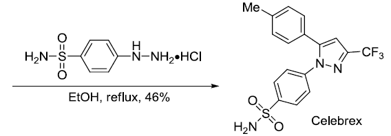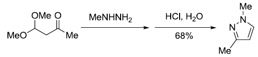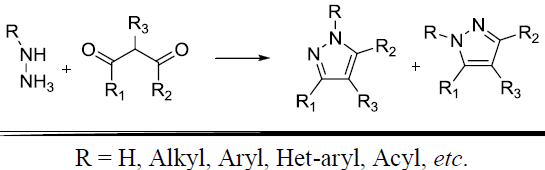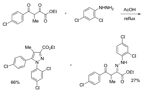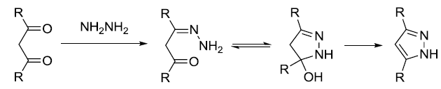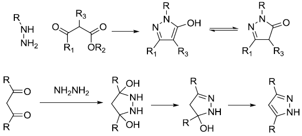 肼或取代肼與β-二羰基化合物反應生成吡唑或吡唑酮環體系。參見Paal-Knorr吡咯合成反應。
