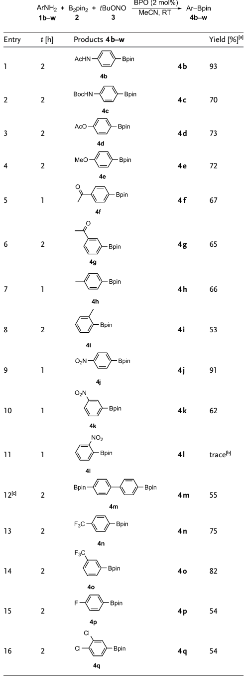 Typical procedure for the reaction of aryl amines1a–w,B2pin22, and tBuONO3:B2pin2 (1 mmol, 254 mg) and BPO (0.02 mmol, 5 mg) were weighed in a 25 mL round-bottom flask. MeCN (3 mL), arylamines (1 mmol), andtBuONO (1.5 mmol, 154 mg) were then added in succession. The resulting reaction mixture was allowed to stir for 1–2 h at room temperature. The solution was then concentrated under reduced pressure and the residue was purified by flash column chromatography.(參考文獻:Angew. Chem. Int. Ed.2010, 49, 1846 –1849)