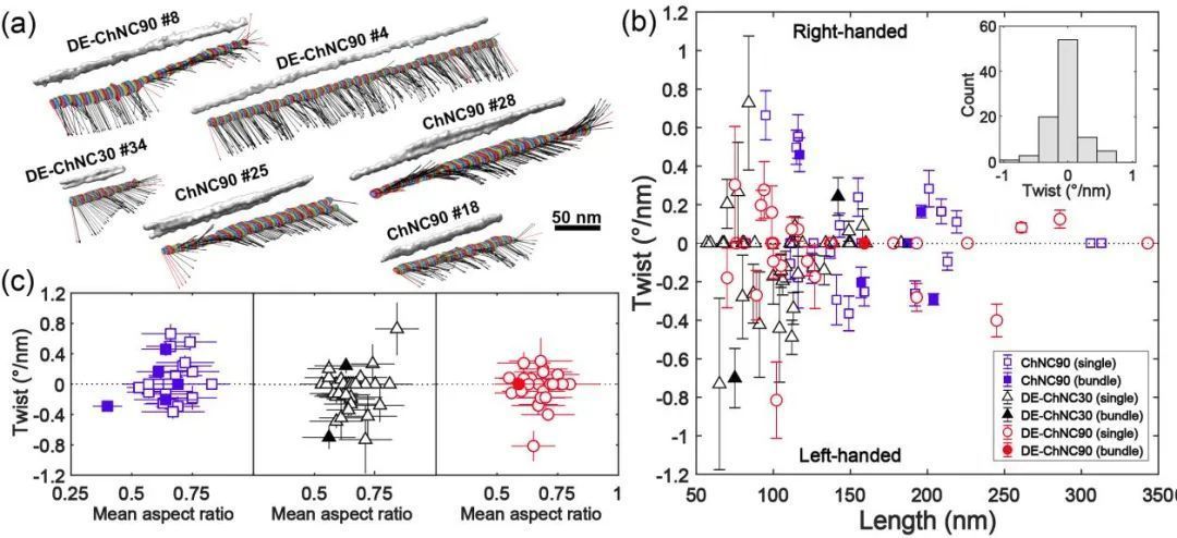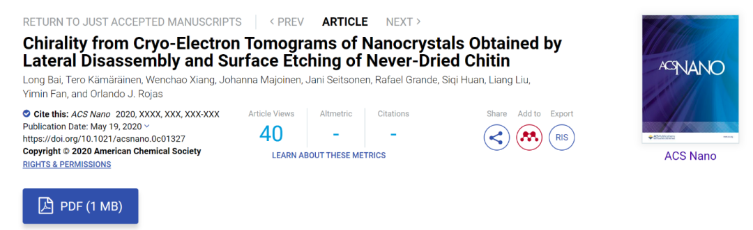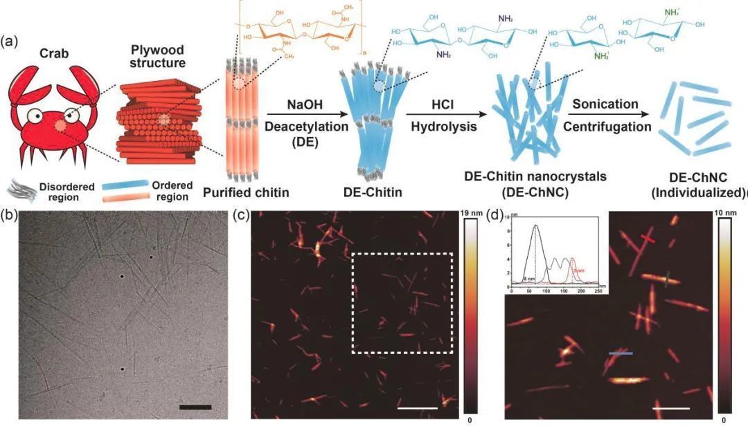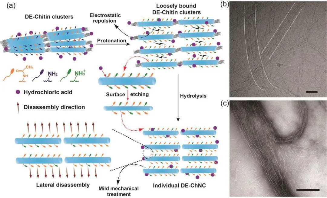 在最新的《ACS Nano》雜志上,由加拿大英屬哥倫比亞大學(xué)、芬蘭阿爾托大學(xué)、南京林業(yè)大學(xué)的研究人員所組成的國(guó)際化團(tuán)隊(duì)實(shí)現(xiàn)了具有新型直棒狀結(jié)構(gòu)的甲殼素納米晶體(chitin nanocrystal)的可控制備,并將冷凍透射電子顯微鏡(Cryogenic-TEM,cryo-TEM)與電子斷層掃描(Electron Tomography,ET)技術(shù)相結(jié)合,精細(xì)解析重構(gòu)了其手性結(jié)構(gòu)。該研究展現(xiàn)了超低溫冷凍電鏡與計(jì)算機(jī)輔助模擬在天然可再生高分子材料精細(xì)結(jié)構(gòu)表征中的應(yīng)用前景,為新型綠色材料的開發(fā)提供了更好的幫助。研究論文題目為“Chirality from Cryo-Electron Tomograms of Nanocrystals Obtained by Lateral Disassembly and Surface Etching of Never-Dried Chitin”眾所周知,纖維素納米晶體(CNC)具有紡錘形棒狀形貌。在常見的酸水解制備甲殼素納米晶體過程中,與CNC相似的紡錘形貌也普遍存在。本研究中,英屬哥倫比亞大學(xué)的Orlando J. Rajas教授團(tuán)隊(duì)在傳統(tǒng)的酸水解制備方法的基礎(chǔ)上,將表面乙酰化調(diào)節(jié)引入到酸水解反應(yīng)前(圖1),賦予可離子化氨基于疏水性甲殼素纖維簇表面,使纖維簇在酸水解過程中帶有表面正電特性。這種帶有電荷的纖維簇結(jié)構(gòu)自發(fā)地形成了簇與簇及簇內(nèi)部的靜電斥力,因此,酸分子更容易滲透進(jìn)入甲殼素簇內(nèi)部,從而使得緊湊排列的簇狀結(jié)構(gòu)可以容易的發(fā)生橫向脫組裝 (圖2)。于此同時(shí),表面陽離子化也在一定程度上增強(qiáng)了甲殼素纖維的表面親水性,使其能夠更均勻的受到酸分子的蝕刻,有利于甲殼素納米晶直棒狀結(jié)構(gòu)的形成。正如該文第一作者英屬哥倫比亞大學(xué)的白龍博士所說,“僅需要簡(jiǎn)單的預(yù)處理過程,就可以實(shí)現(xiàn)天然高分子甲殼素納米顆粒在微觀形貌上的巨大改變,這是極具深入研究探索的科學(xué)現(xiàn)象”。圖1.新型直棒狀甲殼素納米晶體的制備流程及其原位表征的微觀形貌(cryo-TEM和AFM)。圖2.可控調(diào)節(jié)甲殼素纖維簇表面乙酰化程度促進(jìn)了酸水解過程中甲殼素纖維的表面蝕刻與橫向脫組裝過程,進(jìn)而使得單根直棒狀納米晶得以釋放。在該研究中,冷凍電子顯微鏡的成功運(yùn)用為表征甲殼素納米晶體的直棒狀形貌提供了有力的支持。眾所周知,生物質(zhì)材料在電鏡觀察中很容易受到電子束的破壞,為直接觀測(cè)帶來了困難。芬蘭阿爾托的科研人員經(jīng)過探索,對(duì)電鏡樣品制備工藝與觀測(cè)中的參數(shù)設(shè)置都進(jìn)行了優(yōu)化,很好地實(shí)現(xiàn)了天然高分子材料的原位觀察。在得到甲殼素納米晶體于不同電子束角度下的冷凍電鏡結(jié)構(gòu)后,通過電子斷層掃描技術(shù)將其重構(gòu)成三維模型,進(jìn)而可以精細(xì)地解析其微觀形貌及固有的結(jié)構(gòu)特性(圖3)。研究表明,制得的直棒狀納米晶體不具有顯著的手性結(jié)構(gòu),即其單根納米晶不具備扭轉(zhuǎn)特性。這種不具備手性結(jié)構(gòu)的直棒狀甲殼素納米晶體在開發(fā)特殊用途材料方向具有理想的前景,如取向型紡絲、光學(xué)器件等。于此同時(shí),本研究還證明了低溫電子斷層掃描技術(shù)在生物質(zhì)天然高分子材料領(lǐng)域的可行性,為進(jìn)一步分析生物質(zhì)基納米材料的特性、豐富其結(jié)構(gòu)認(rèn)知提供了技術(shù)保障。圖3. 通過cryo-TEM的表征和ET的重構(gòu)模擬,實(shí)現(xiàn)了隊(duì)單根甲殼素納米晶體微觀結(jié)構(gòu)的精細(xì)重現(xiàn),并分析了其在不同制備條件下的手性扭轉(zhuǎn)行為。https://pubs.acs.org/doi/abs/10.1021/acsnano.0c01327