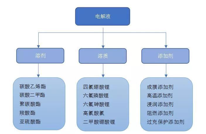 鋰離子電池四大關鍵材料包括正極、負極、隔膜、電解液,其中電解液在電池正負極之間進行離子和離子化合物的傳輸,它的性能直接決定了鋰電池的電導率、容量和輸出電壓。電解液一般由高純度的有機溶劑、溶質和少量添加劑按一定比例配制而成,其主要組成部分如圖所示。