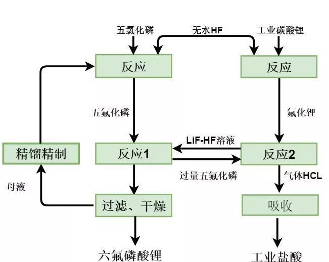 森田新能源材料有限公司(日資控股)使用氟化氫液體于五氯化磷反應得到PF5與氯化氫的混合氣體,再將該混合氣體通入到氟化氫和LiF中制得六氟磷酸鉀溶液。所得六氟磷酸鉀溶液經過濾除去不溶性雜質,濾液進行攪拌晶析,最后進行干燥得到六氟磷酸鋰產品。該方法易于進行且易于控制,工藝流程如圖所示。