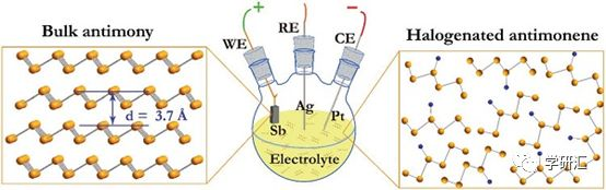圖1、電化學(xué)剝離與同步鹵化制備鹵化銻烯過程