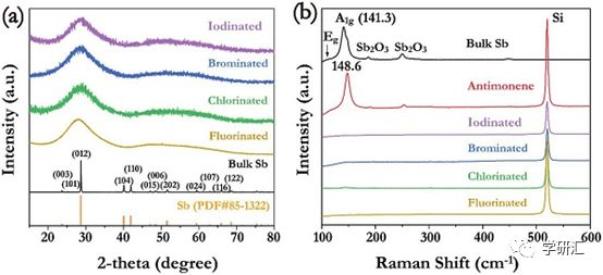a) 不同鹵化銻烯的XRD圖譜;