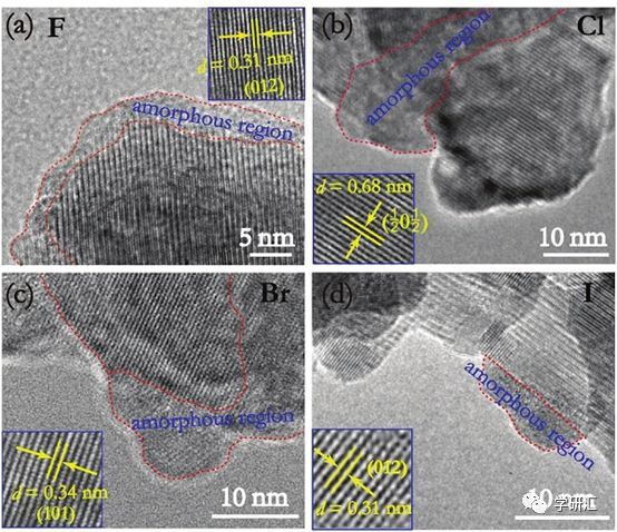 氟化、氯化、溴化和碘化銻烯的HRTEM圖。納米片在剝離和鹵化后,局部會(huì)轉(zhuǎn)變?yōu)闊o定形結(jié)構(gòu),其余部分仍然是晶體結(jié)構(gòu),具有典型的晶格條紋特征。
