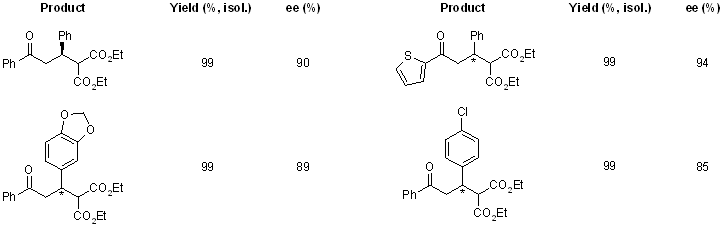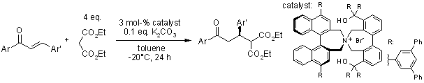 使用手性季銨溴化物作為催化劑,在溫和的相轉(zhuǎn)移條件下,已將丙二酸二乙酯高對(duì)映選擇性和有效地邁克爾加成到各種查爾酮衍生物中。