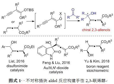 從炔基取代的烯醇硅醚或聯(lián)烯酸酯出發(fā), 通過形成炔基烯醇負離子從而與醛或酮發(fā)生不對稱插炔aldol反應, 是一種高效合成手性2,3-聯(lián)烯醇的策略(Scheme 1). 2016年, List小組[4]采用手性磺酰亞胺(disulfonimide)實現(xiàn)了首例芳香醛的Mukaiyama類型的不對稱插炔aldol反應; 馮小明和劉小華團隊[5]利用Au/手性氮氧配體實現(xiàn)了聯(lián)烯酸酯與靛紅的直接不對稱插炔aldol反應. 然而上述例子均未能實現(xiàn)脂肪醛的相關轉化, 可能底物易發(fā)生自身縮合等副反應. 2018年, Yu和Kim團隊[6]利用化學計量的手性硼試劑, 預先與聯(lián)烯酸酯形成手性炔基烯醇硼中間體, 隨后進攻多種醛化合物形成相應的2,3-聯(lián)烯醇. 盡管該方法能實現(xiàn)脂肪醛的有效轉化, 但采用化學計量手性硼試劑嚴重影響了反應的經(jīng)濟性.