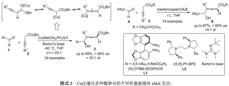中國科學院上海有機化學研究所殷亮課題組一直致力于Cu(I)催化的不對稱插烯加成反應研究, 系統(tǒng)發(fā)展了不對稱直接插烯aldol反應[7]、Mannich型反應[8]等. 最近, 他們推測Cu(I)能與非共軛炔酸酯生成親核性銅物種, 進而與醛類化合物發(fā)生不對稱加成反應(Scheme 2)[9].經(jīng)系統(tǒng)篩選后, 該小組發(fā)現(xiàn)芳(雜)醛1與b-炔酸酯2在Cu(CH3CN)4PF6和大位阻雙膦配體(R)-DTBM-SEG-PHOS (L1)的催化以及2-叔丁基四甲基胍為堿(Barton’sBase)的條件下, 能順利地進行插炔aldol反應, 以良好的收率、優(yōu)異的g-區(qū)域選擇性以及立體選擇性得到相應的手性2,3-聯(lián)烯醇(3) (Scheme 2). 更為重要的是, 更具挑戰(zhàn)性的脂肪醛4(包括鏈狀及環(huán)狀), 也可與b-炔酸丁炔酯(5)在2,4,6-三甲苯基銅[mesitylcopper(I)]和手性膦配體(R,R)-Ph-BPE (L2)的作用下, 以較好的收率、非對映選擇性和優(yōu)異的對映選擇性實現(xiàn)類似反應, 多類官能團均能良好兼容(Scheme2).