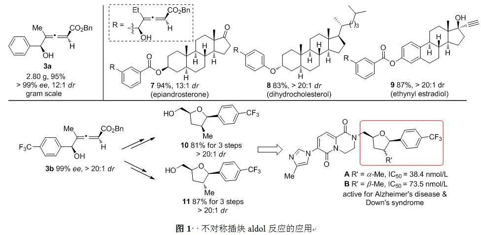 他們還探索了該不對稱直接插炔aldol反應的合成應用性: 該催化反應放大至克級, 也能以優(yōu)異結果得到產(chǎn)物3a(圖1); 另外, 含甾體結構芳香醛也可應用于該策略, 高效、高立體選擇性地構建了含有表雄酮、二氫膽固醇或炔雌醇骨架的2,3-聯(lián)烯醇(7~9), 為活性分子的快速衍生化提供更多選擇. 同時, 作者還從插炔aldol產(chǎn)物3b出發(fā), 通過幾步簡單反應快速合成了多取代呋喃的一對差向異構體10和11, 是有望用于治療多種神經(jīng)性疾病的化合物的關鍵片段.