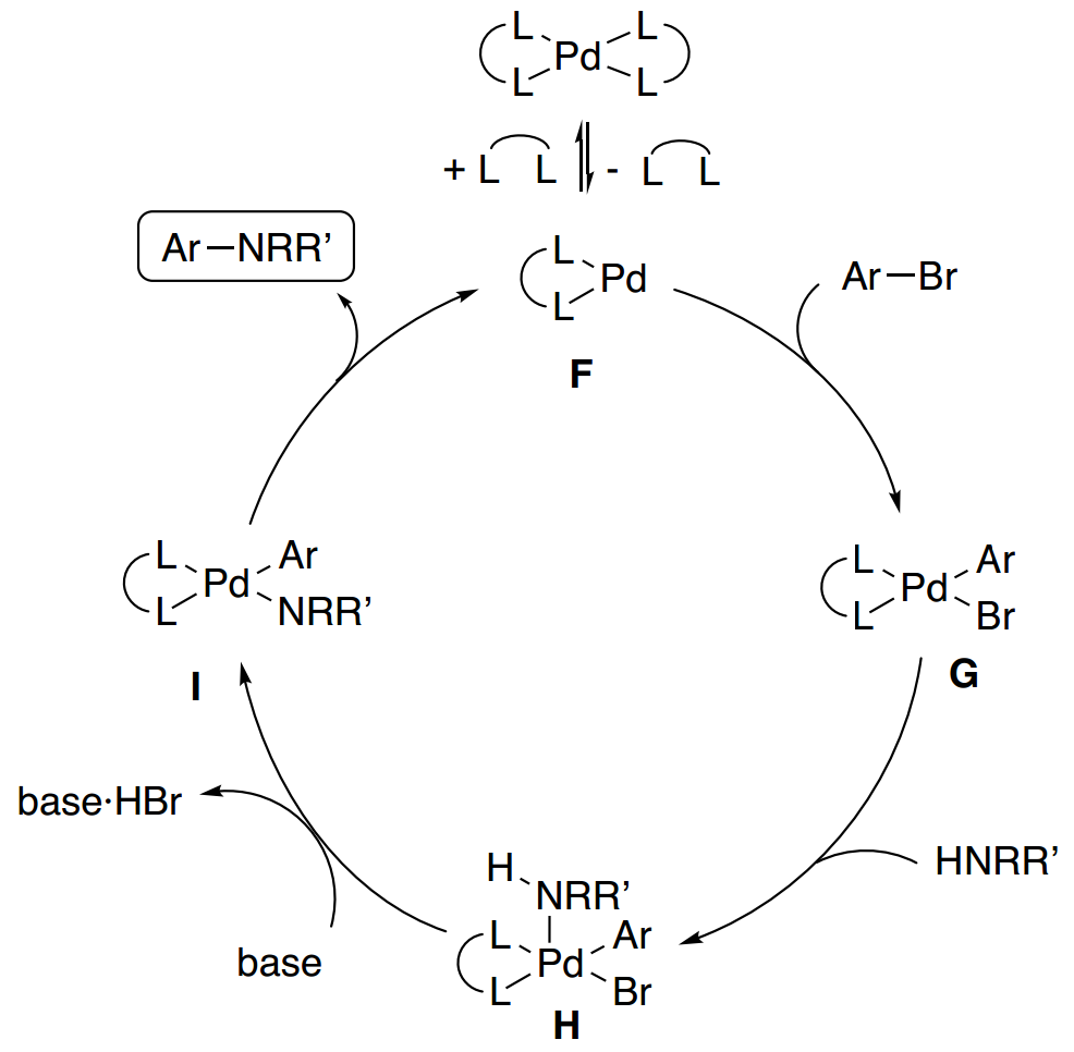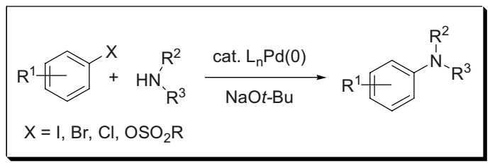 鈀催化下,胺與芳基鹵化物發(fā)生交叉偶聯(lián),生成胺的N-芳基化產(chǎn)物。