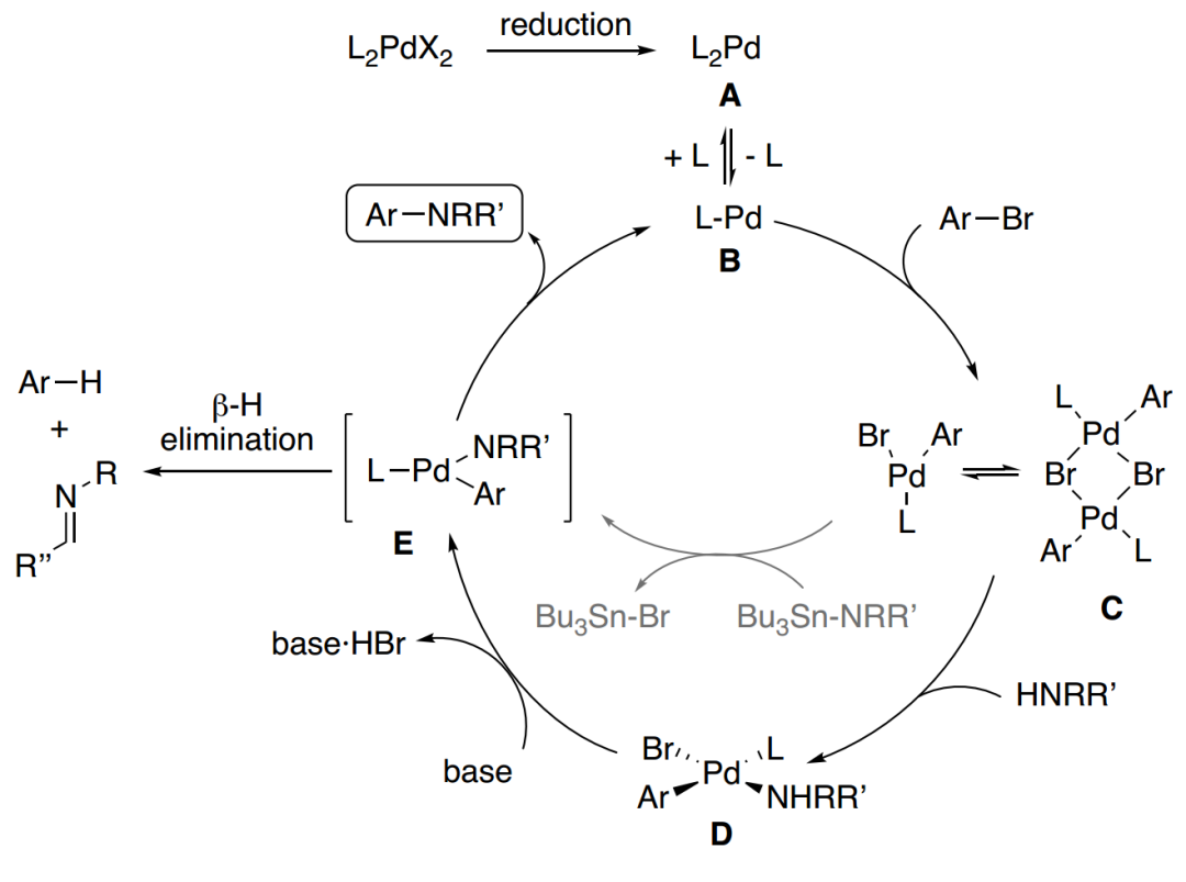 第一代反應(yīng),使用三(鄰甲基苯基)磷為配體,伯胺在這樣的條件下有可能經(jīng)歷貝塔-氫消除過(guò)程。