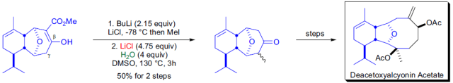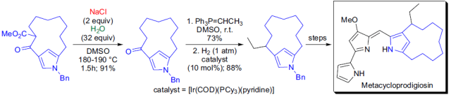 含活潑亞甲基的酯在堿金屬鹽存在下,DMSO中脫除烷氧羰基。該反應可取代乙酰乙酸乙酯合成法和丙二酸酯合成法中最后酯的水解和脫羧兩步反應。值得一提的是,Krapcho反應是一意外發現,原先的目的是用KCN進行Sn2取代反應,缺意外的得到部分氧羰基脫除產物。后來反現堿金屬LiI,LiCl,KCN,NaCN,LiCN均可用于這個反應。