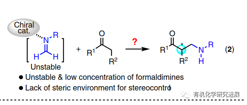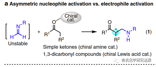 作為曼尼希反應的一個重要的分支,羰基化合物的α-胺甲基化是引入胺甲基到簡單有機分子的一種強大的方法,生成的β-胺基羰基化合物可以用于合成許多天然產物和生物活性分子。一般來說甲醛衍生的亞胺或者亞胺鹽都不太穩定,通常是由甲醛與芳香胺反應,或者由α-氨基甲基醚,N,O-乙縮醛,1,3,5-三芳基-1,3,5-三嗪原位生成。在此背景下,通過胺或手性Lewis酸催化劑不對稱活化親核性的羰基化合物已經被用于實現該類轉化的不對稱轉化。雖然活化親核試劑的策略可行并且有較好的對映選擇性,但是該親核試劑通常限定于本身較為活潑的底物,如:未修飾的酮和1,3-二羰基化合物。另一方面,雖然手性Br?nsted酸活化穩定的亞胺的策略已經被廣泛應用到不對稱曼尼希反應,但是這種親電不對稱活化的策略目前尚未被應用到原位生成的甲醛亞胺的胺甲基化反應中,可能歸因于甲醛亞胺的不穩定的性質以及碳原子上缺少有效的空間位阻環境無法實現更好的立體選擇性控制。