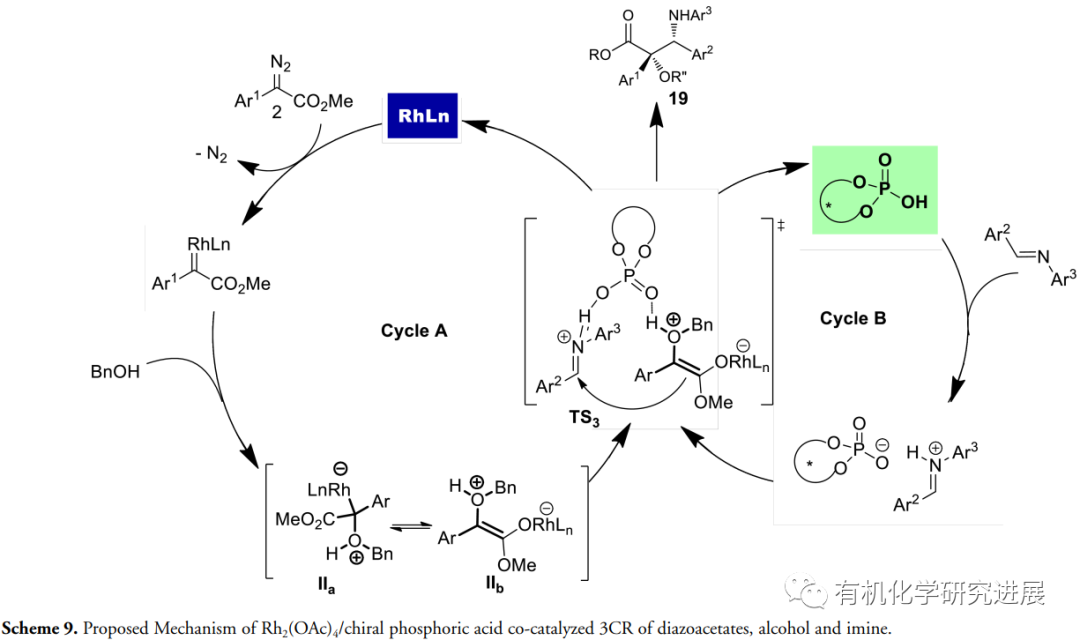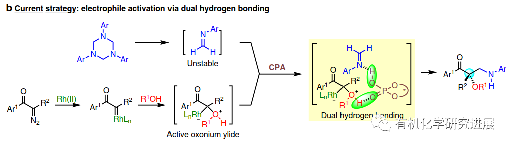 近些年,胡文浩課題組已經證實基于活性鎓葉立德親電捕獲的金屬卡賓參與多組分策略能很好的實現以前反應低效甚至不可能的反應。而這其中,曼尼希類型的芳亞胺捕獲氧鎓的反應可以快速合成β-氨基醇。在銠/手性磷酸(CPA)的協同催化下,CPA在氧鎓和亞胺底物上的雙氫鍵活化很好的保證了該反應的立體控制(10.1002/tcr.201600124)。