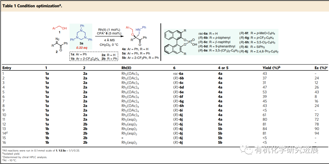 設計這種三組分反應有三個挑戰:(1)1,3,5-三嗪原位生成的醛亞胺在反應體系中的濃度很低,因此親核試劑捕獲氧鎓變得很低效,更傾向于得到非目標的O-H插入產物。(2)1,3,5-三芳基-1,3,5-三嗪在金屬催化下可能與重氮進行[4+1]環加成反應,降低目標的三組分反應產物的產率;(3)還沒有實驗證實是否CPA和兩個活性中間體能有效的形成雙氫鍵,這也是由于它本身不穩定的性質、反應過程中的濃度低、原位生成醛亞胺的碳原子上缺少取代基。